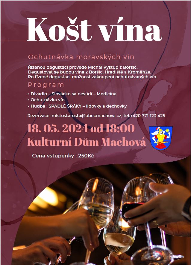 Obec Machová zve v sobotu 18. května na Košt vína. Přijďte posedět a shlédnout divadelní představení ochotníků z Machové a ochutnat víno ze Slovácka. K tanci i poslechu hraje kapela SPADLÉ ŠRÁKY.