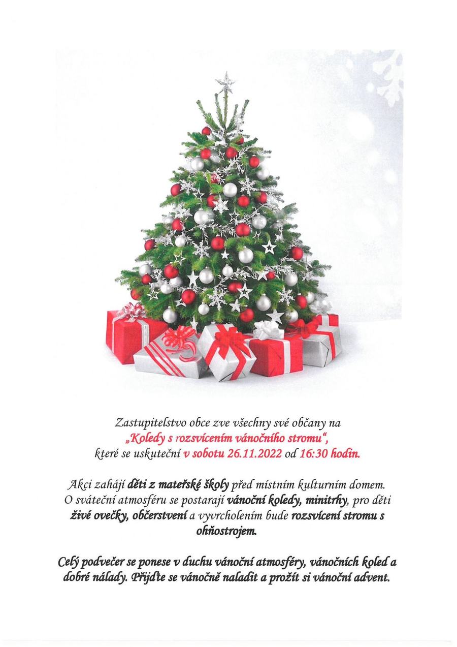 Zastupitelstvo obce zve všechny své občany na "Koledy s rozsvícením vánočního stromu", které se uskuteční v sobotu 26.11.2022 od 16:30 hod.