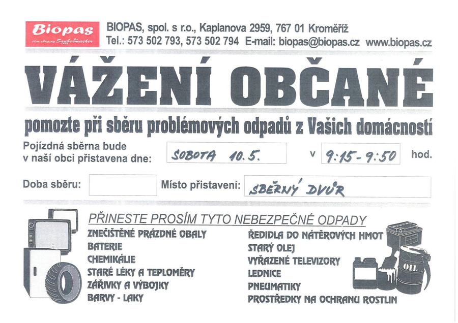 V sobotu 10.5.2025 provede firma Biopas sběr nebezpečných odpadů. Pojízdná sběrna bude přistavena od 9:15 do 9:50 u sběrného dvoru.