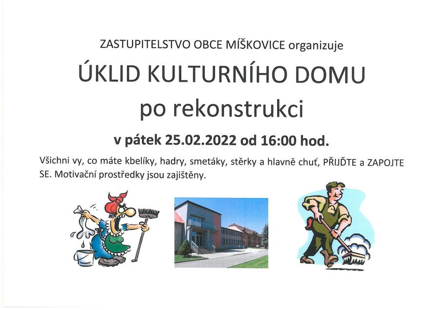 Zastupitelstvo obce Míškovice organizuje v pátek 25.2.2022 od 16:00 hod úklid kulturního domu po rekonstrukci.