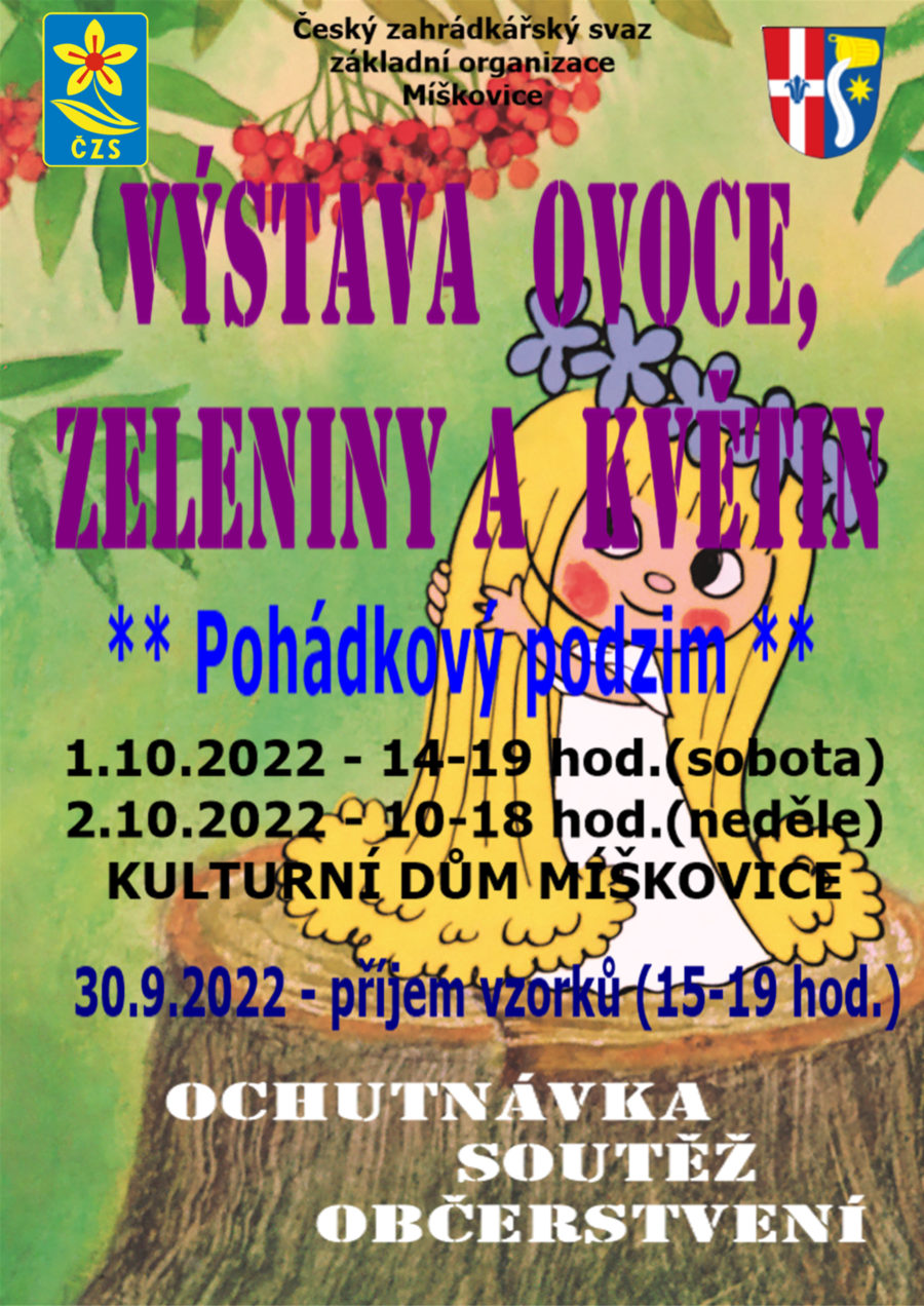 Český zahrádkářský svaz Míškovice ZO pořádá ve dnech 1.10. - 2.10.2022 na sále kulturního domu Výstavu ovoce, zeleniny a květin.